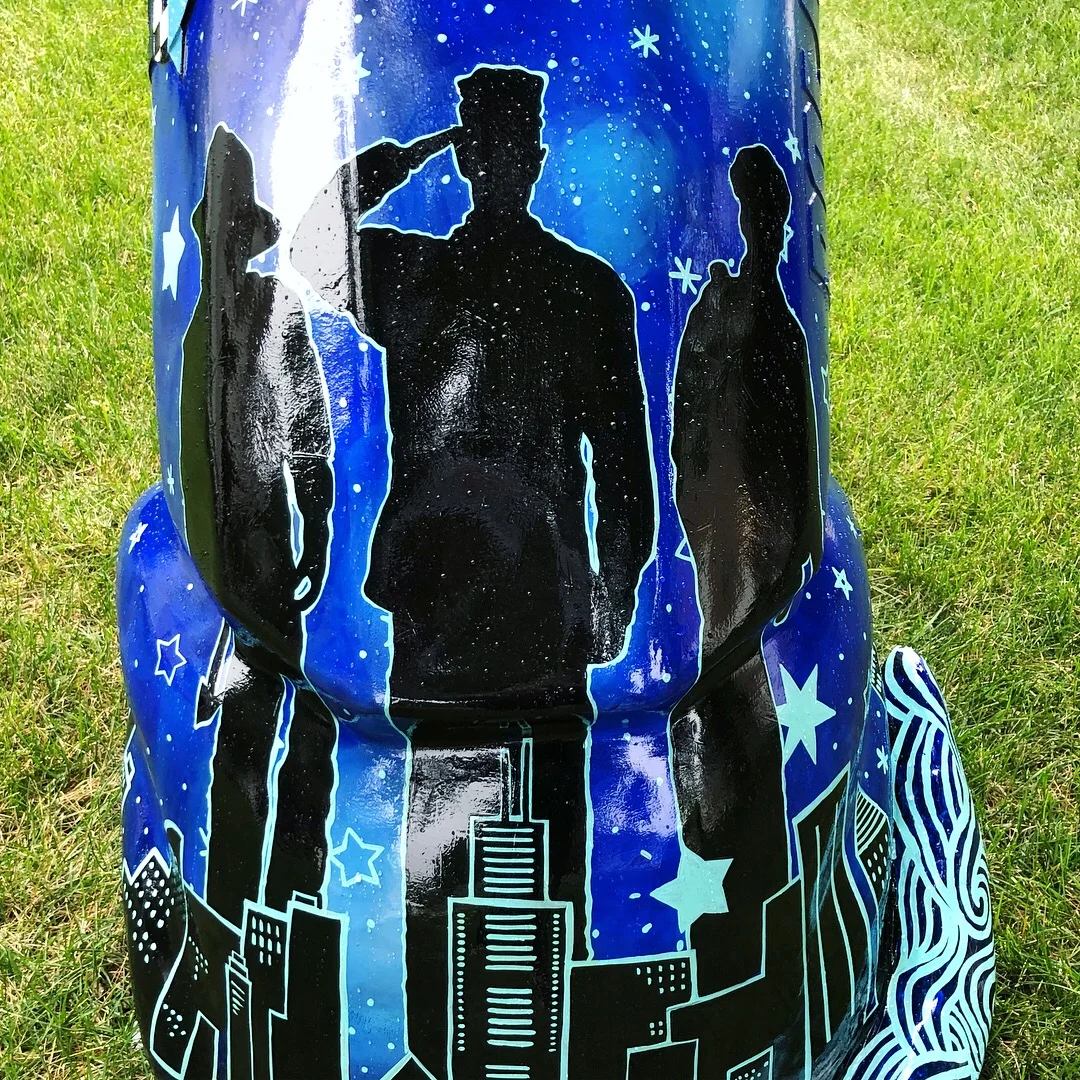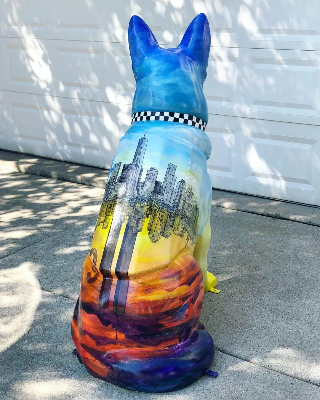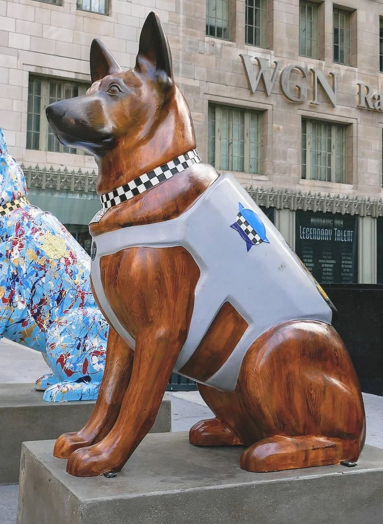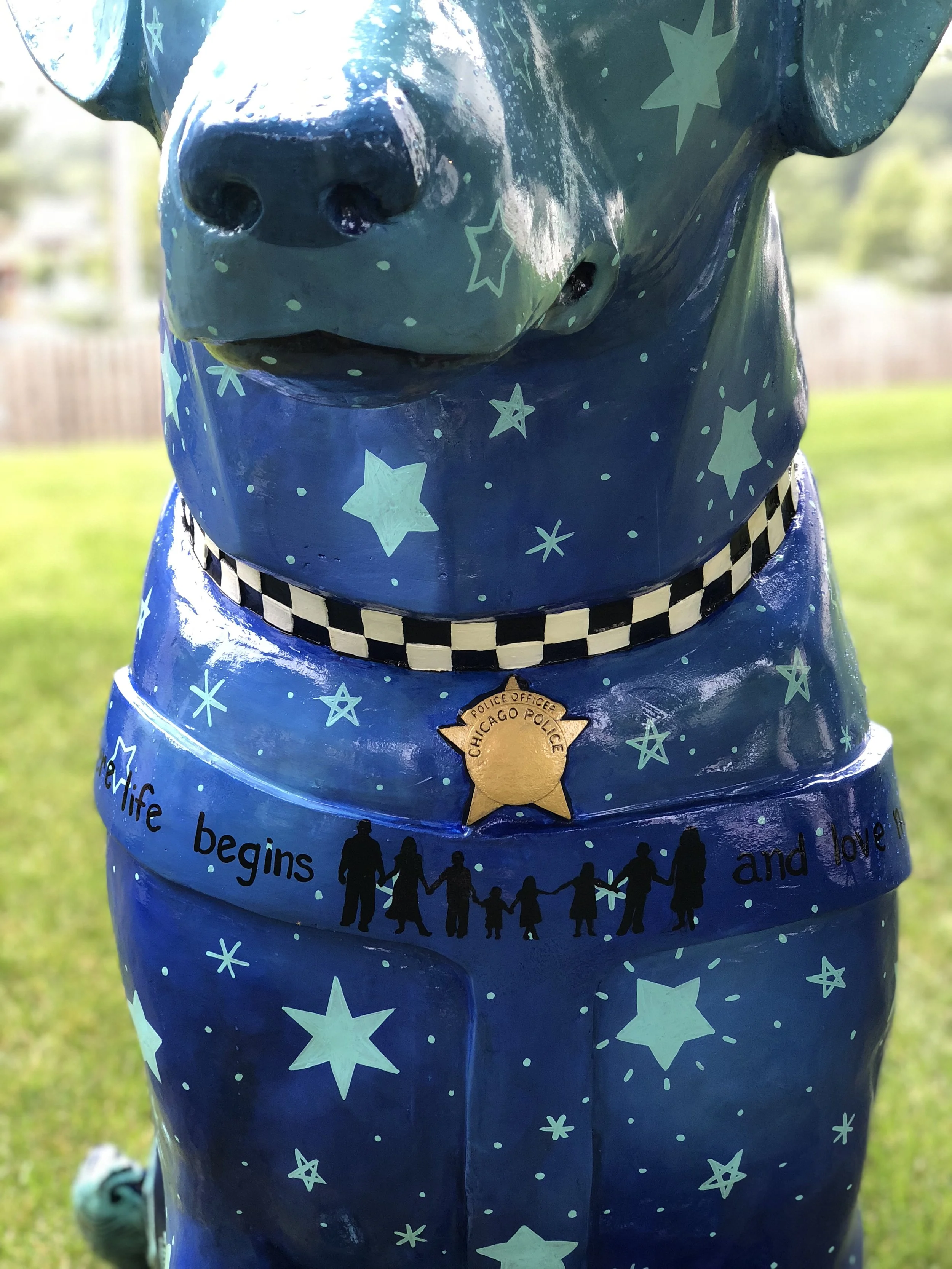 Schwarber’s Neighborhood Heroes recognizes first responders by honoring their heroism, courage, and devotion to duty. This K9 was designed in that same likeness, featuring a firefighter, a soldier, and a police officer standing behind the city of Chicago.