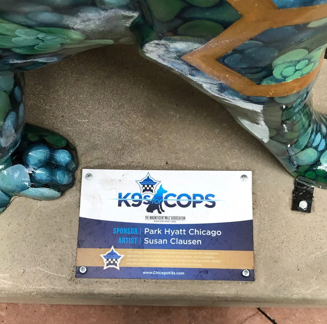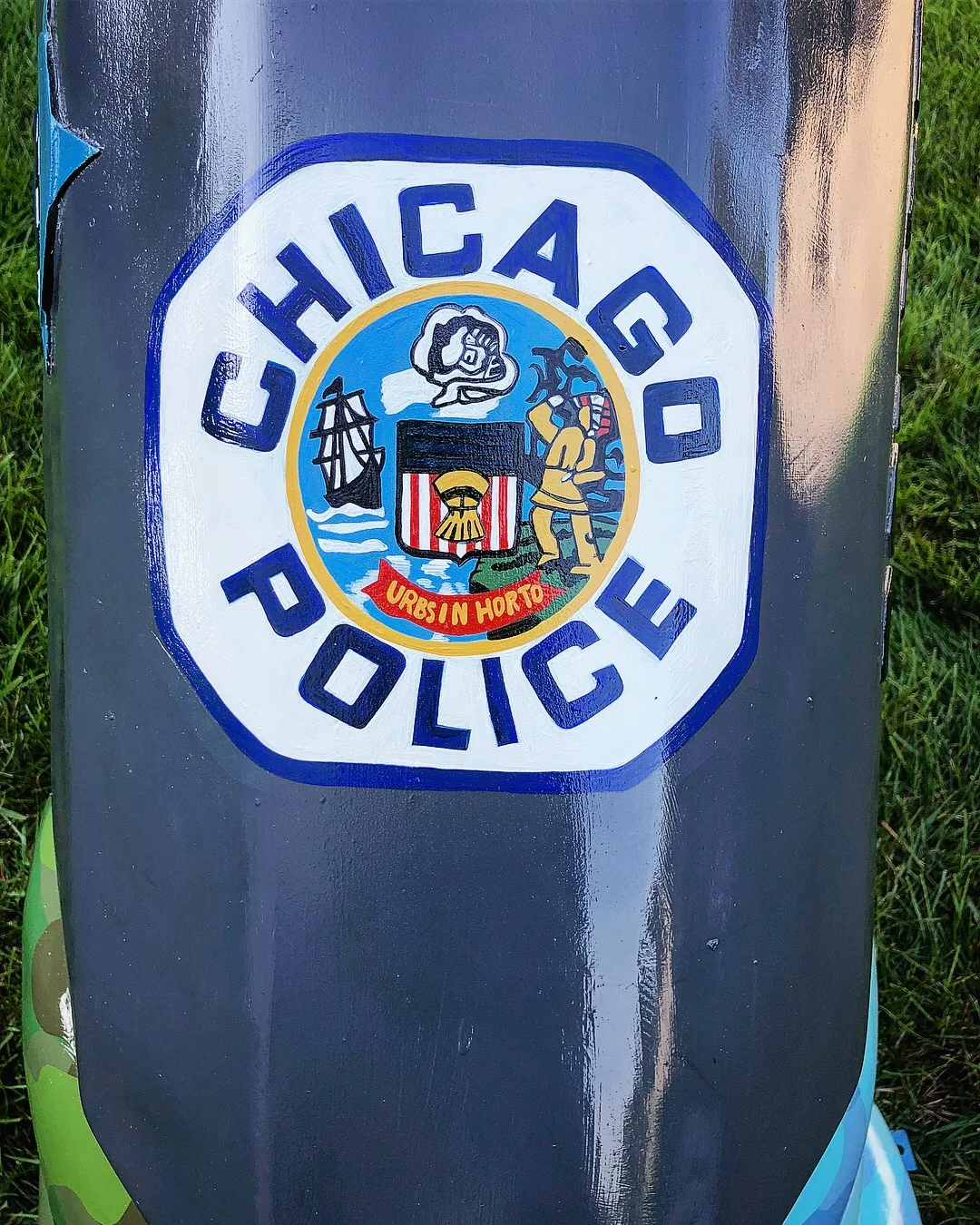 This K9 was designed for a CPD Lieutenant. It has many design elements significant to his experience in the CPD, including his love for the city, his Irish heritage, and Lieutenant chevrons.